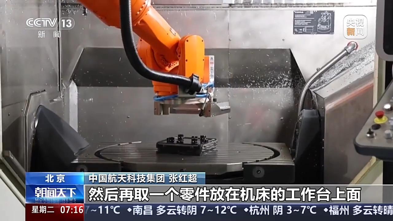 *中國航天科技集團 張紅超:*這台設備現在正在開展的是機械手的自主換裝工作,它會把加工完的零件放到工作站,然後再取一個零件放在機牀的工作台,機牀工作台的定位精度能夠達到微米級。