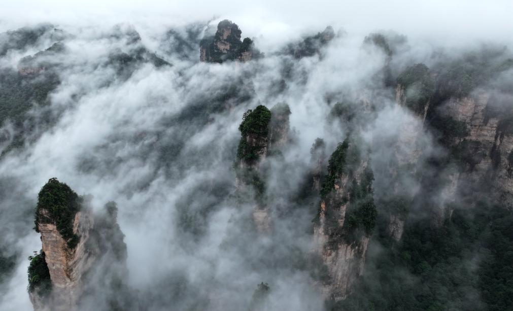 2024年10月14日,湖南張家界國家森林公園天子山雲霧繚繞(無人機照片)。新華社發(吳勇兵攝)
