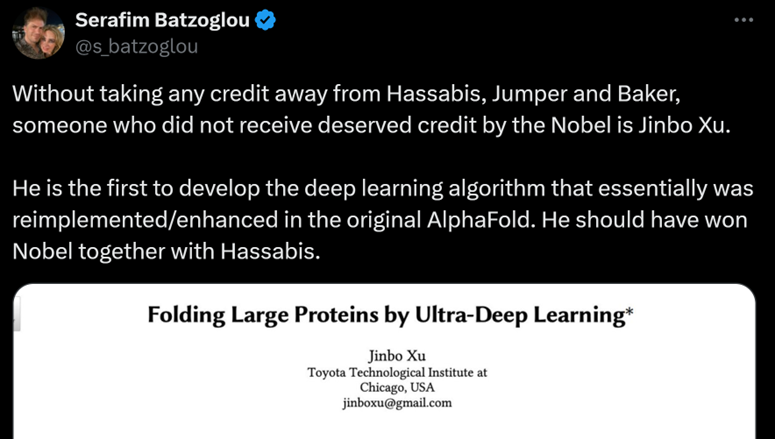 國際計算生物學會會士、原斯坦福人工智能實驗室(Stanford AI Lab)教授塞拉菲姆-巴佐格洛(Serafim Batzoglou)更是公開發文表示,許錦波第一個開發出(精準預測蛋白結構)的深度學習算法,這一算法後來被複現和增強到最初版本的AlphaFold中,他應與哈薩比斯一起獲得諾獎。