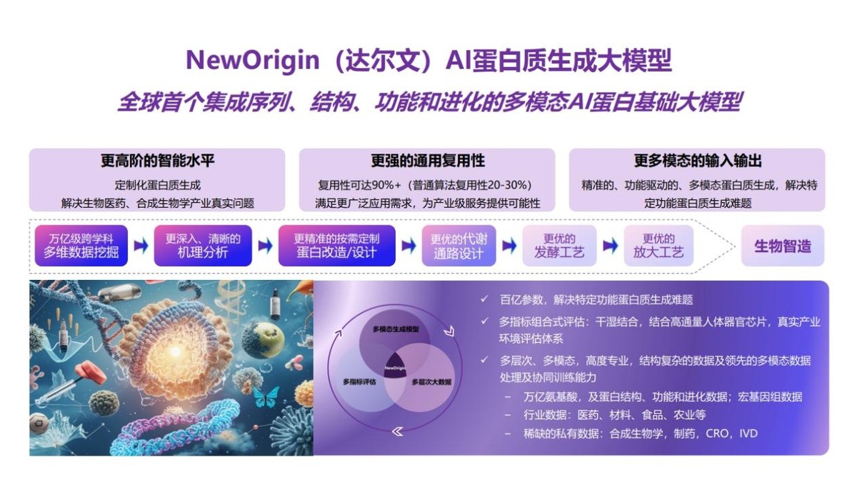 在2023世界人工智能大會上,分子之心又推出了全球首個集成序列、結構、功能和進化的產業級AI蛋白質生成大模型——NewOrigin(中文名:達爾文),這也是面向生物經濟時代的基礎設施級底層大模型。