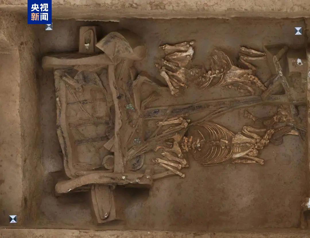 此次發掘規模最大的墓葬為豎穴土壙墓,葬具為一棺一槨。棺槨之間西側有頭箱,頭箱上部放置有四堆動物骨骼,內部放置隨葬陶器。墓主腐朽嚴重,頭向西,葬式為仰身屈肢葬。墓主南側隨葬有銅劍、銅戈、銅箭鏃等,可能是一名武士。隨葬有金器、玉石器、陶器、鐵鐲子等共計176件。根據隨葬陶器初步判斷,墓葬時代為戰國中晚期。其陪葬車馬坑內埋藏有3輛車,現僅對西部的1輛車進行了清理,車為雙輪單轅木車,車前駕2匹馬,車轅、馬頭朝東。馬車結構清楚,車輿東南角有傘柄遺痕。馬骨保存完整,呈卧伏姿態,兩馬頭部後腦相抵,北側馬頭面朝北,南側馬頭面朝南。