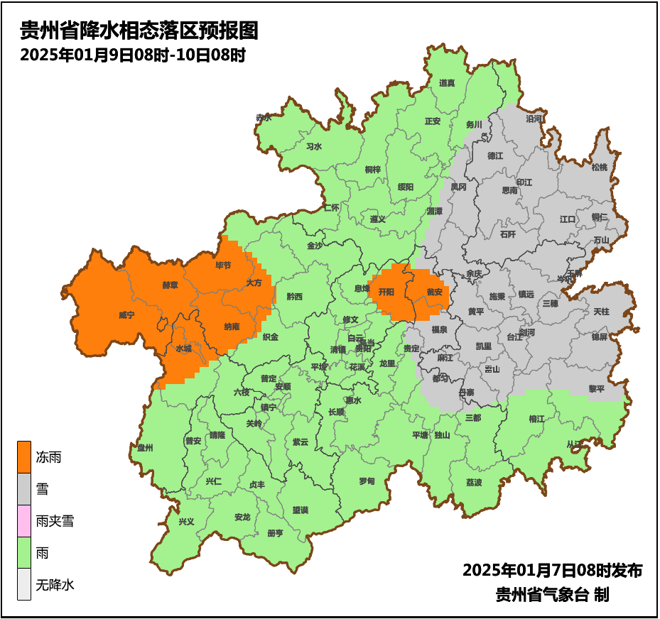 9日,上午銅仁市、黔東南州中北部陰天有小雪,其餘地區陰天為主,夜間全省各地陰天有小雨,中西部地區有凍雨。