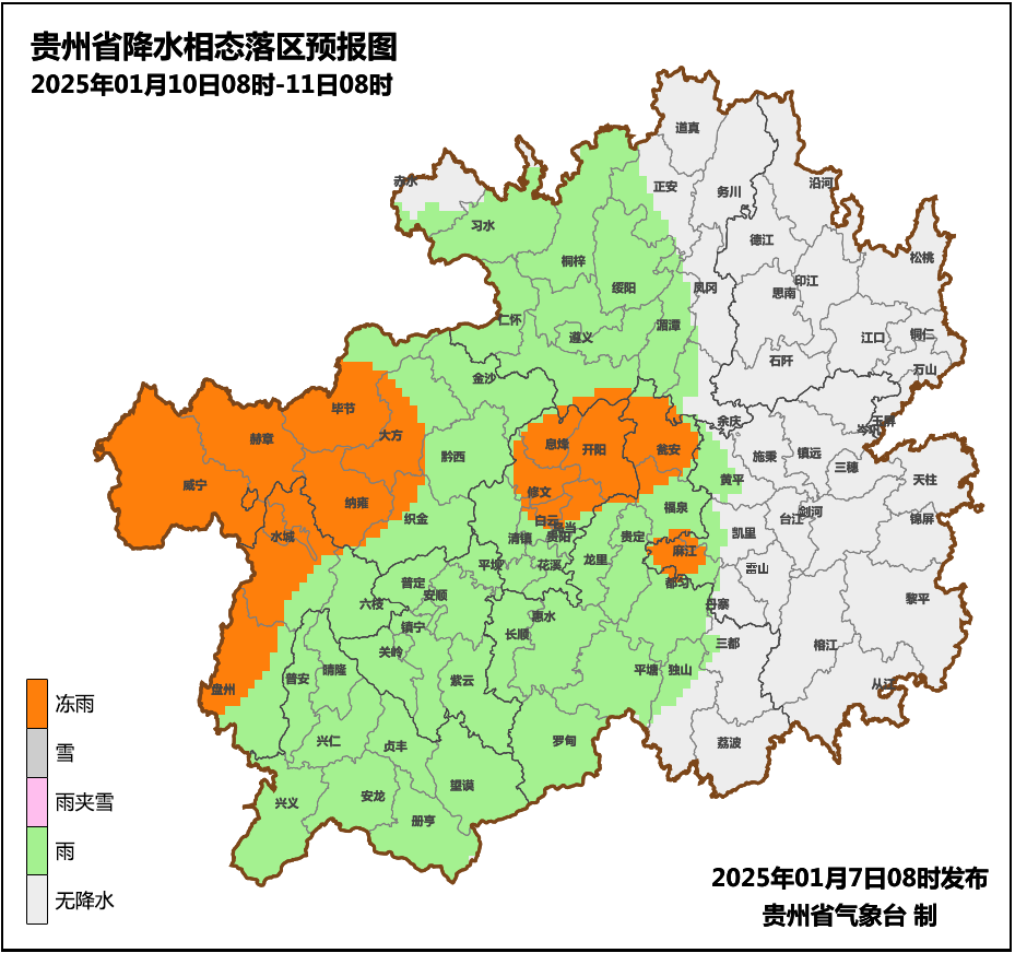雨雪方面,7日凍雨雪範圍較小,畢節市中西部、貴陽市北部及黔南州北部夜間有凍雨或雨夾雪;8日雨雪範圍擴大,傍晚至夜間省的西北部地區陰天有小到中雪,南部地區陰天有小雨,其餘地區小雨轉雨夾雪或小雪;畢節市中西部、六盤水市西部北部、貴陽市北部、黔南州北部、黔東南州北部及銅仁市中部有中到大雪。9日至10日,雨雪逐漸減弱,但中部一線仍有凍雨(雪);11日全省雨雪止轉為多雲到晴天氣。