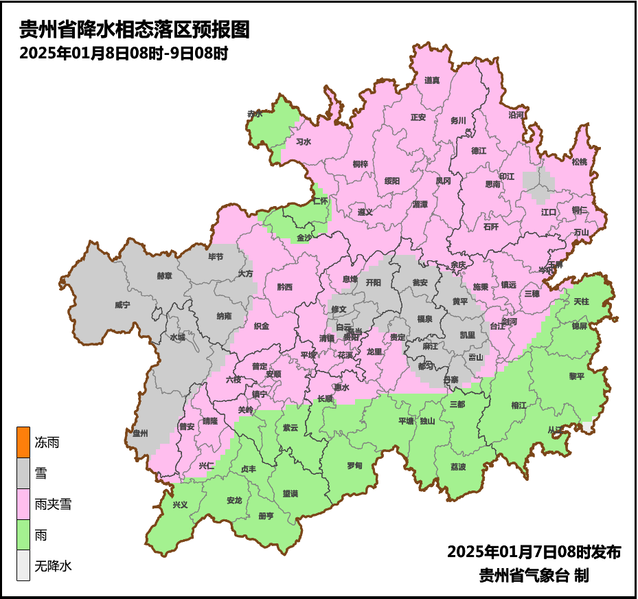 根據最新氣象資料分析,今日(7日)至10日受冷空氣逐步增強影響,貴州中北部地區將逐步由雨轉雪(雨夾雪),部分路段將出現道路結冰,各地氣温將持續下降,10日省內大部分地區氣温將降至0℃及以下。今日夜間西部局地有凍雨或雨夾雪,8日傍晚至9日上午中北部地區轉為雨夾雪或小雪,中部一線有中到大雪,9日下午至10日雨雪減弱,但低温維持,仍有凍雨雪天氣。11日雨雪止轉多雲到晴。需重點關注本輪低温雪凝天氣過程對交通運輸、能源保供、生產生活等方面的影響。