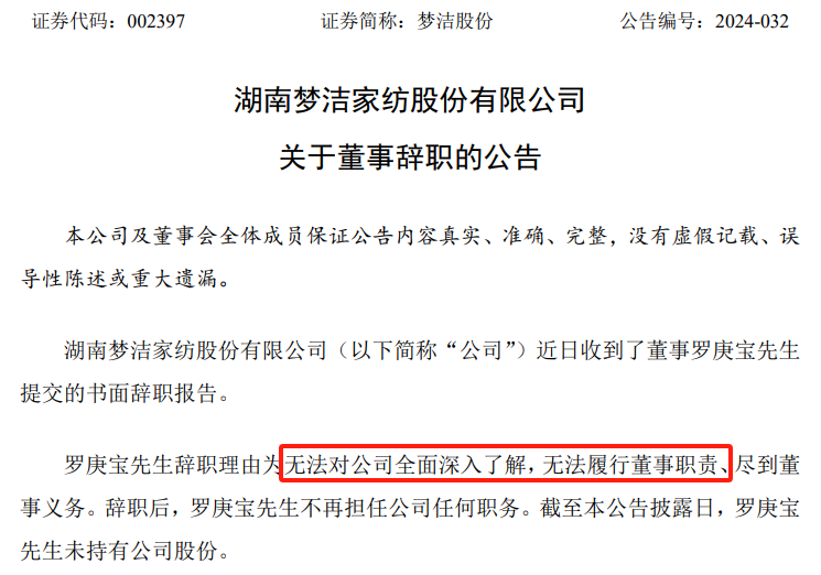 關注函回覆公告中的平靜表述,無法掩蓋夢潔股份董事會層面的動盪。在前述兩位董事對2022年年報投出了反對票之後,金森新能提名的董事戴曉鳳、劉彥茗、李國富及獨立董事胡型,先後於2023年5月、9月、12月提出辭職,理由均為個人原因;投出了反對票的董事羅庚寶則於2024年8月22日提出辭職,給出的理由則是“無法對公司全面深入瞭解,無法履行董事職責、盡到董事義務”,更將夢潔股份的控制權之爭擺到了枱面上。