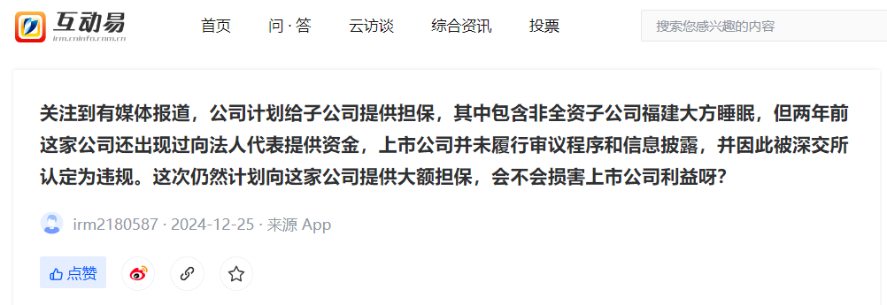 在此前一日,有投資者在深交所互動平台向夢潔股份提問:“公司計劃給子公司提供擔保,其中包含非全資子公司福建大方睡眠,但兩年前這家公司還出現過向法人代表提供資金,上市公司並未履行審議程序和信息披露,並因此被深交所認定為違規。這次仍然計劃向這家公司提供大額擔保,會不會損害上市公司利益呀?”
