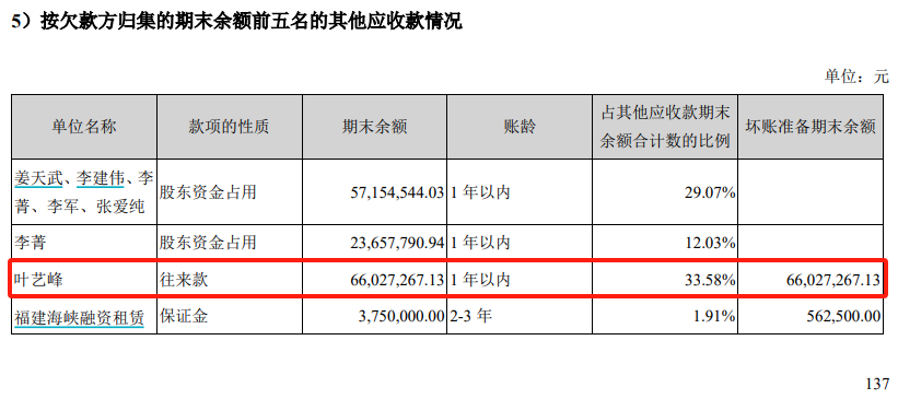 公開信息披露顯示,夢潔股份在2021年年報中確認了對葉藝鋒的其他應收款債權,款項性質為“股東資金佔用”,涉及金額高達6601.73萬元,上市公司對此全額計提了資產減值,並構成夢潔股份2021年度出現大額虧損的主要原因之一。