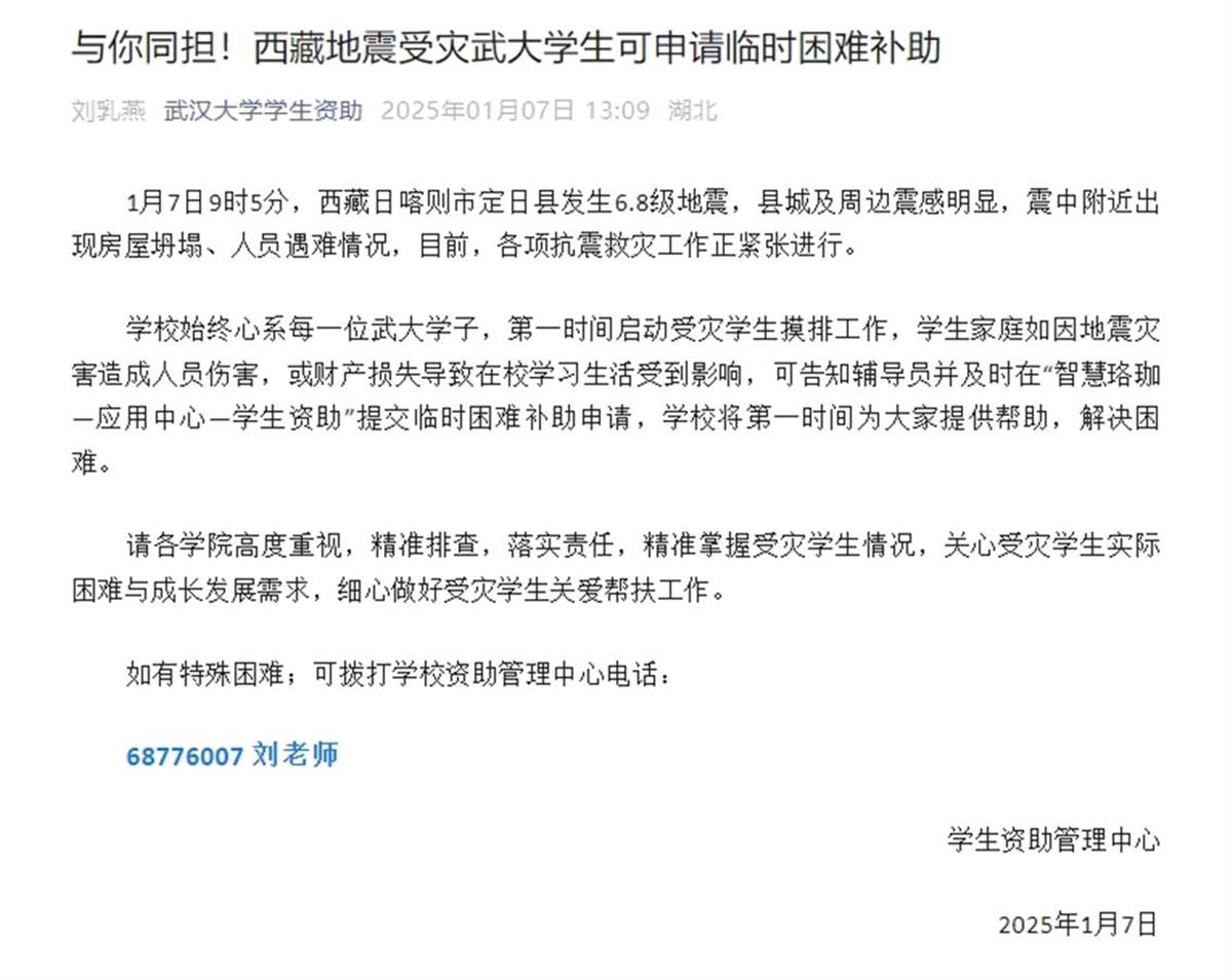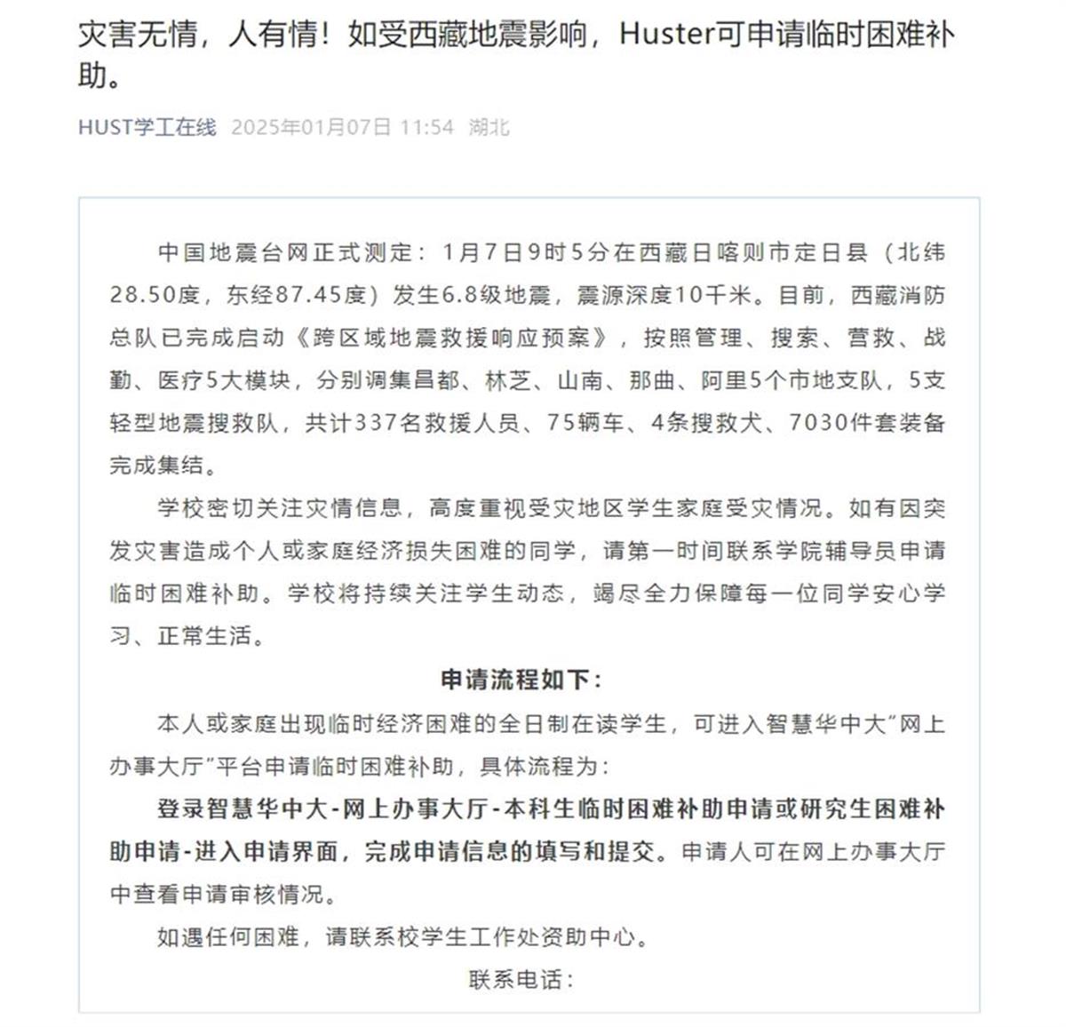 今天(7日)9時5分,西藏日喀則市定日縣發生6.8級地震,造成重大人員傷亡。災情牽動人心,極目新聞記者注意到,武漢大學、華中科技大學等湖北多所高校也發佈緊急通知,為受災地區學生提供臨時困難補貼!