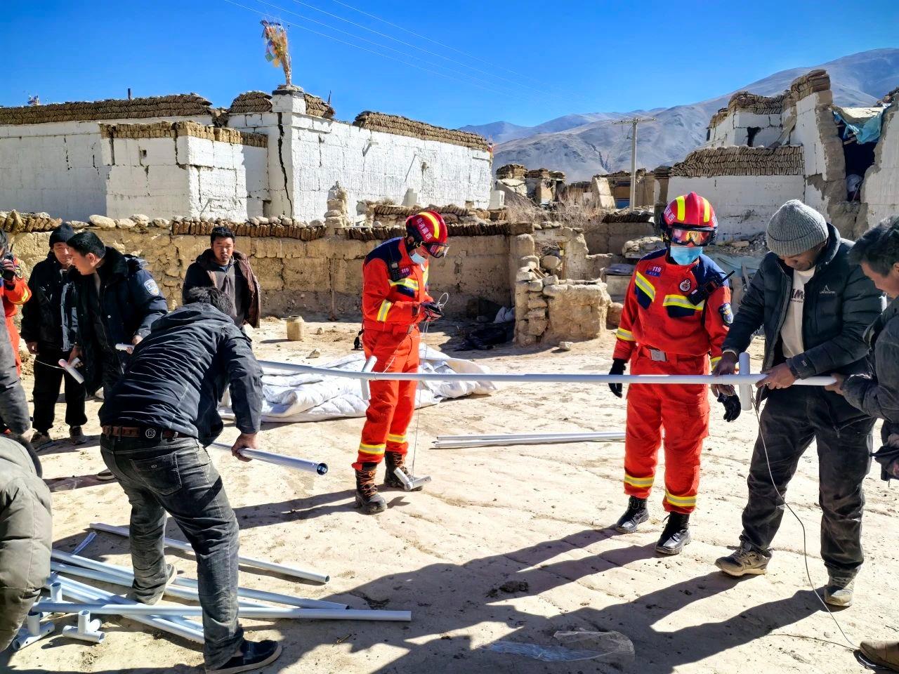消防員正在幫羣眾搭建帳篷。圖源:國家消防救援局