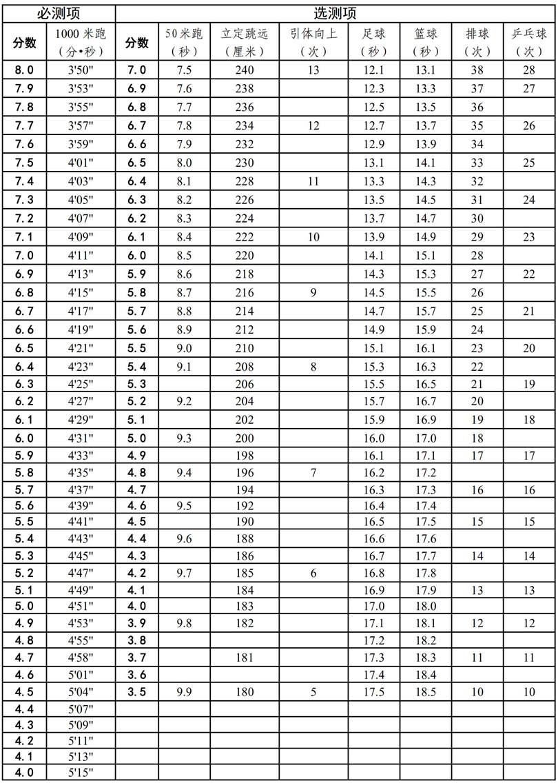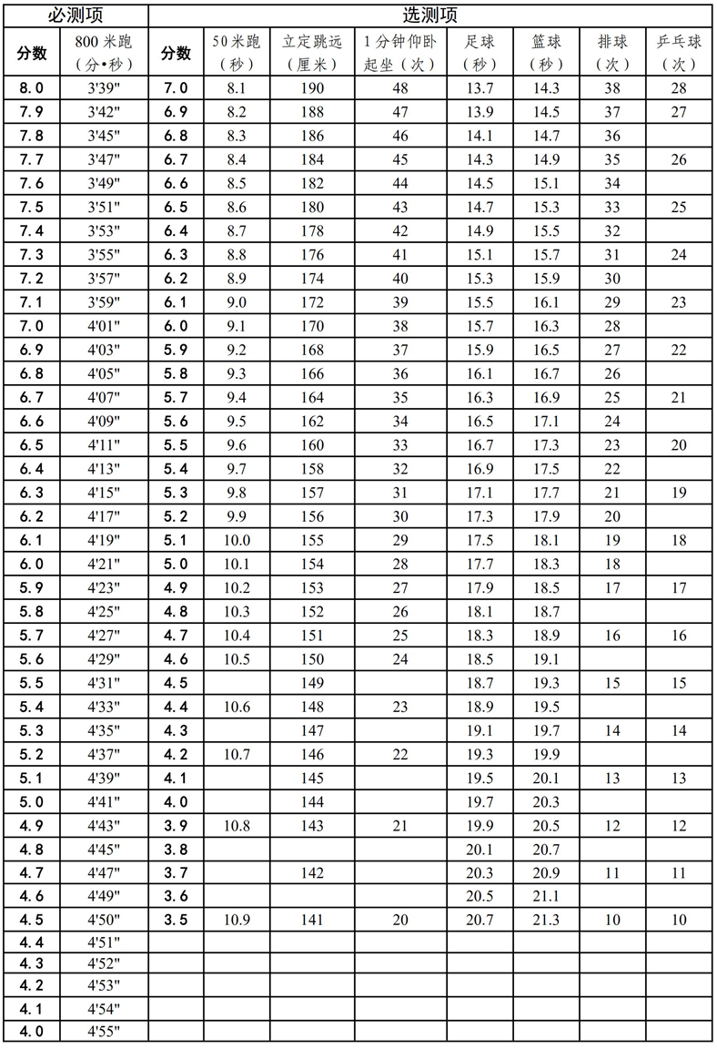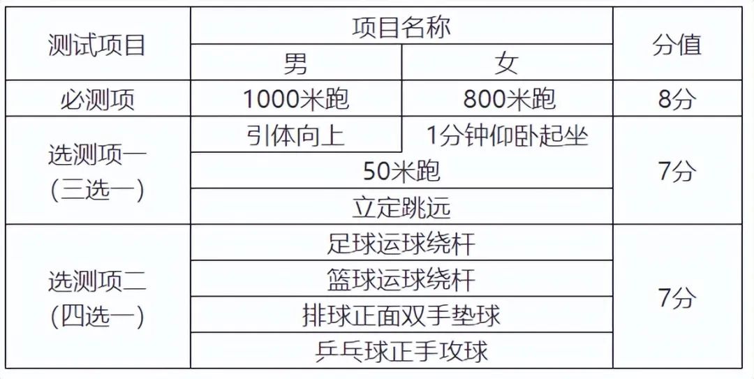 (四)體育統一測試成績的量化辦法。統一測試成績滿分22分,分為必測一項和選測二項,共計三項,內容和分值如下: