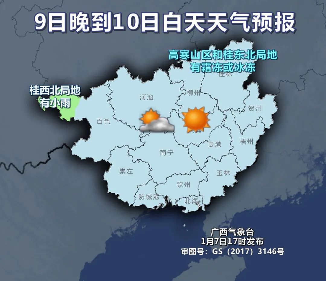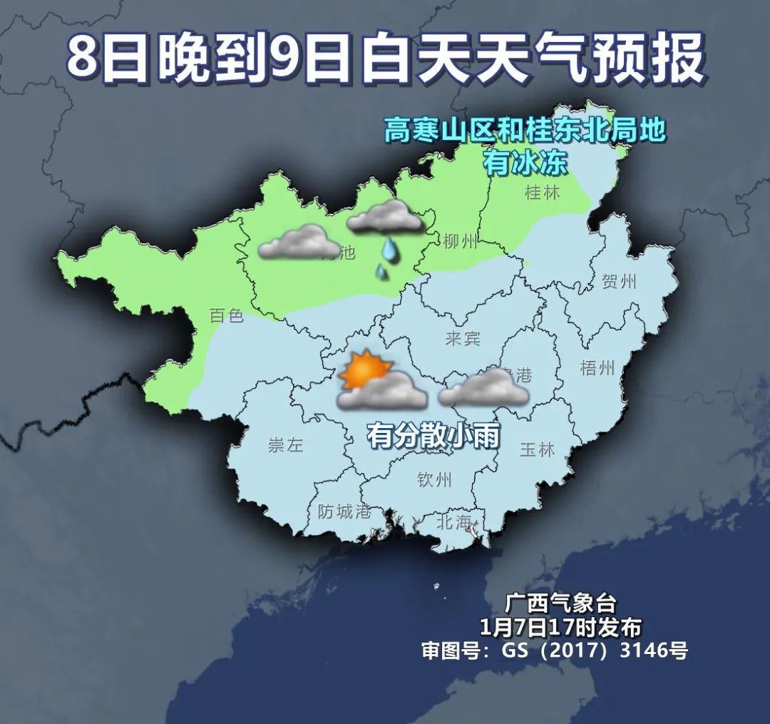 根據桂林氣象部門最新預測,未來10天,全市各地將以多雲間晴天氣為主,高寒山區局地有冰凍或霜凍。8-10日和15-16日有兩次冷空氣影響,其中8-10日氣温下降5-7℃、局地8℃以上,冷空氣影響期間有3-4級偏北風、陣風強度或達6-7級。