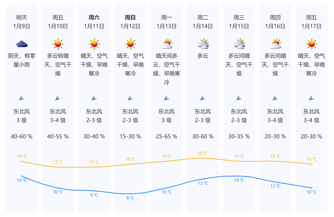 預計8日多雲,氣温14℃-21℃;9日陰天,有零星小雨,晝夜温差減小;