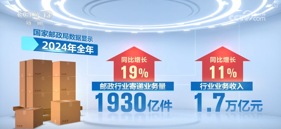 *央視網消息:*記者1月8日從國家郵政局獲悉,2024年,全年郵政行業寄遞業務量和行業業務收入分別完成1930億件和1.7萬億元,快遞業務量連續11年穩居世界第一。國家郵政局預計2025年郵政行業仍將繼續保持穩步上升態勢。