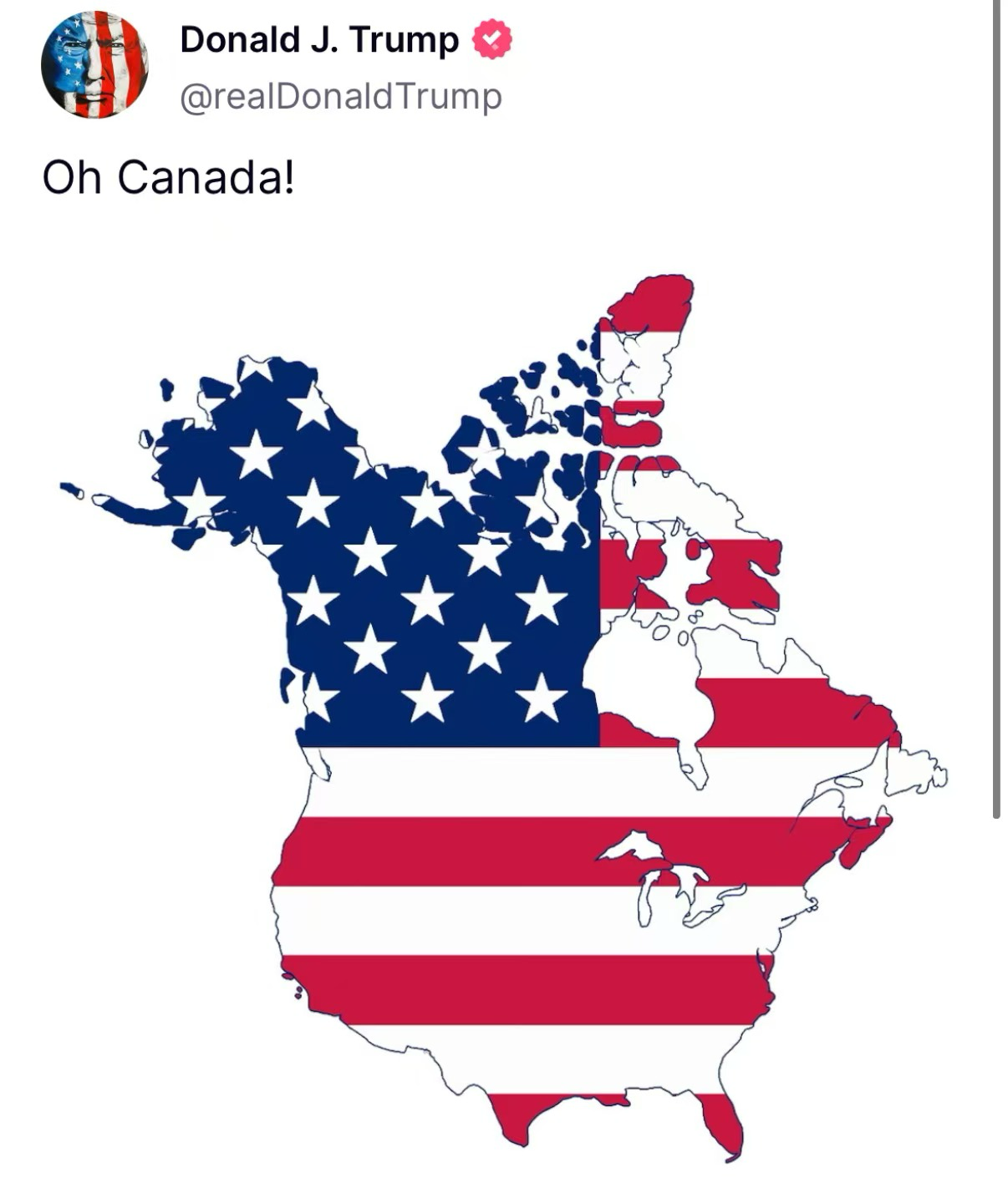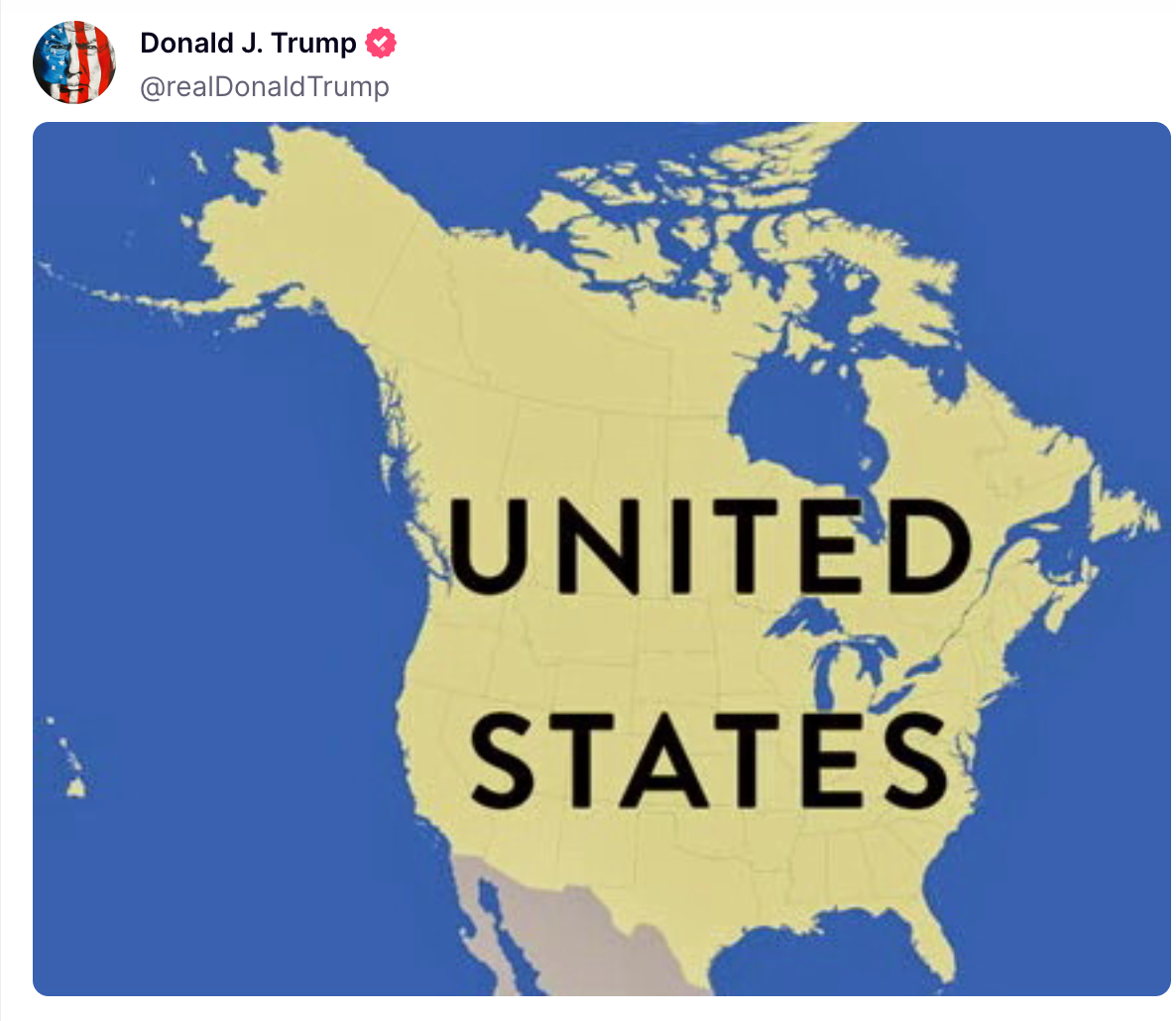 報道提到,當地時間7日早些時候,特朗普在其自創社交平台發佈一張“加拿大被納入美國”之後的“美國全新版圖”。在這張圖中,加拿大和美國被塗成同一種顏色,上面用英文大寫字母寫着“美國(UNITED STATES)”。此前幾分鐘,特朗普還在另一條帖文配圖中將美國和加拿大領土“合併”,併為“全新版圖”填充上美國國旗圖案,配文“哦,加拿大!”