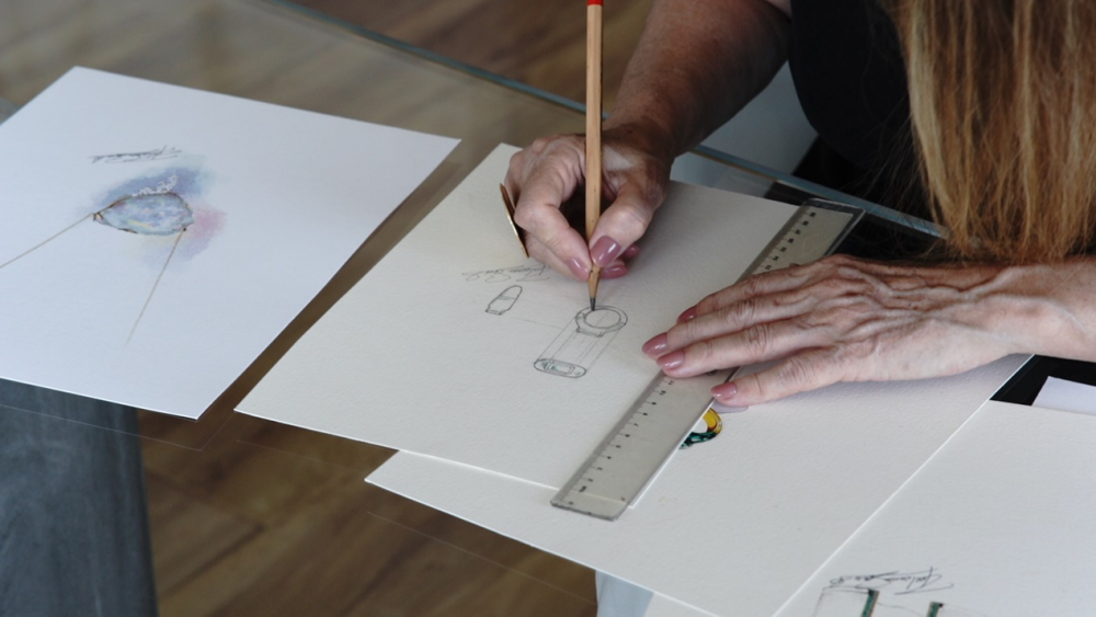 西班牙珠寶設計師帕洛瑪·桑切斯在工作室中繪製設計圖紙。(楊京麗攝)