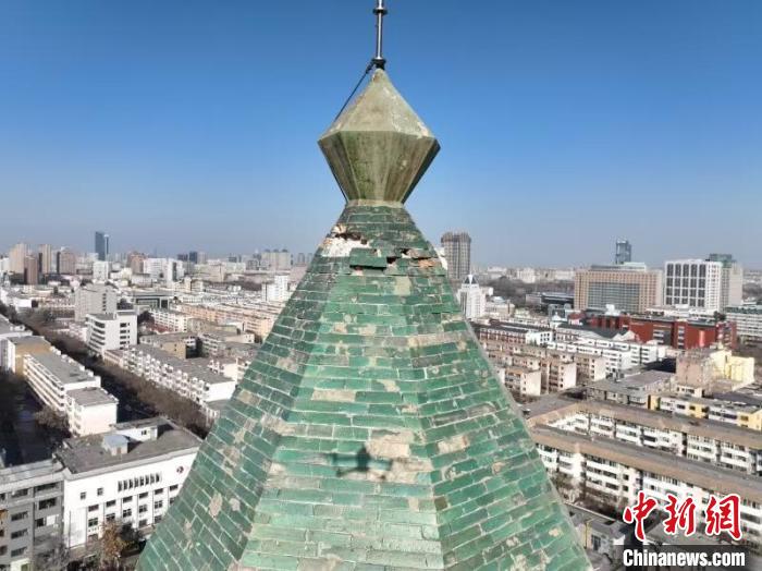 承天寺塔塔剎剎身琉璃磚鬆動錯位並脱落。寧夏文旅廳供圖