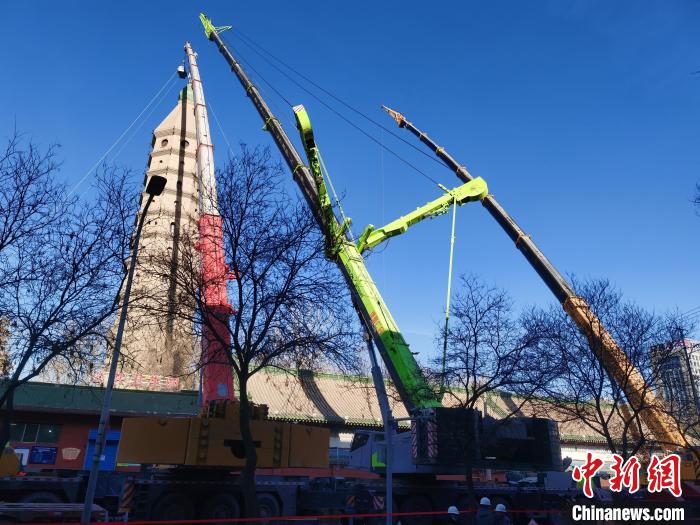 中新網銀川1月8日電 (記者 李佩珊)1月2日以來,寧夏銀川市連續多次發生地震,造成位於銀川市老城區的地標性古建築——西夏古塔承天寺塔受損嚴重,塔剎剎身上部(靠近寶珠位置)第3-6層琉璃磚鬆動錯位並脱落、塔頂寶珠嚴重傾斜,並伴隨餘震出現了位移現象,存在較大的安全風險。1月8日,承天寺塔正式啓動除險搶修工作。