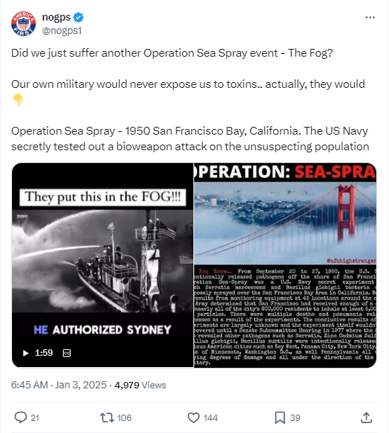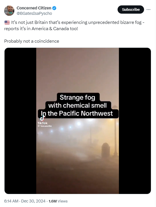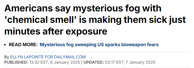 據英國《每日郵報》6日報道,自2024年12月以來,美國多地出現“神秘大霧”,不少人自稱接觸後不久就發燒咳嗽。這也引發了美國社交媒體上的陰謀論,一些恐慌的民眾懷疑,這場大霧並非是單純的空氣問題,而是美軍在對民眾秘密進行“生物戰實驗”。