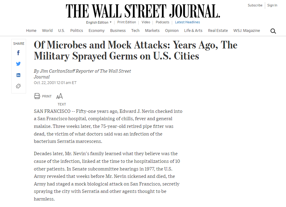 美國中央情報局2012年解密的檔案顯示,美國海軍曾於1950年開展了一次秘密生物武器實驗,在長達一週的時間裏,美國海軍在舊金山海岸附近拋灑粘質沙雷氏菌等病原體,利用舊金山市的43個監測點對有害物質的擴散情況進行監測。
