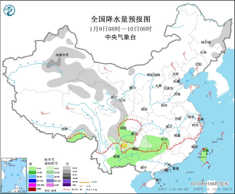 圖2 全國降水量預報圖(1月9日08時-10日08時)