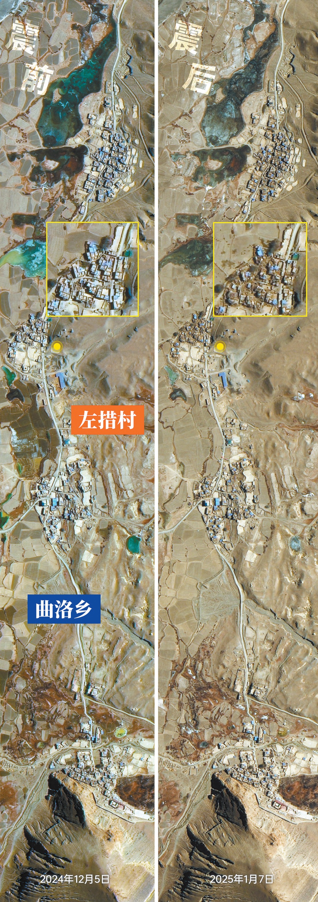 《環球時報》記者1月8日從長光衞星獲悉,為掌握受災區域即時情況,長光衞星在震後緊急調度“吉林一號”衞星過境西藏定日縣,對災區進行觀測;並在成像後第一時間提供給相關單位,助力地震救災工作。定日縣措果鄉是1月7日6.8級地震的震中所在地。根據吉林一號衞星1月7日拍攝到的高分辨率圖像可以看到,措果鄉的房屋多為土坯房,地震中倒塌嚴重。此外,衞星圖像還顯示,受災較為嚴重的長所鄉房屋多為土木結構,抗震性能較差,在地震中倒塌嚴重。定日縣曲洛鄉房屋多為土木結構,在地震中倒塌嚴重。鄉政府積極搭建臨時帳篷,為受災羣眾提供臨時住所。