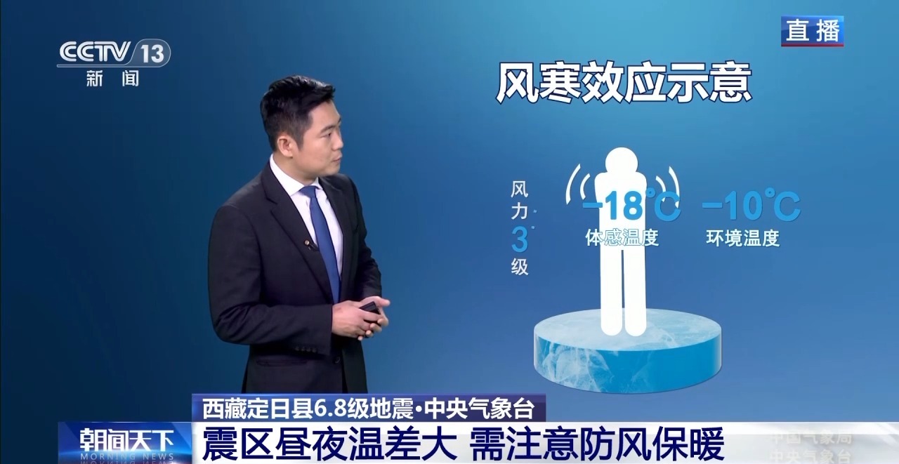 今日7日,西藏日喀則定日縣的氣温只有-14℃,體感温度在-18℃左右。預計今天午後最高氣温會上升到3℃。明後兩天震區天氣變化不大,最低氣温不足-10℃,最高氣温5℃左右,晝夜温差可以達到15℃左右,天氣整體以晴為主,有利於救災物資運輸。