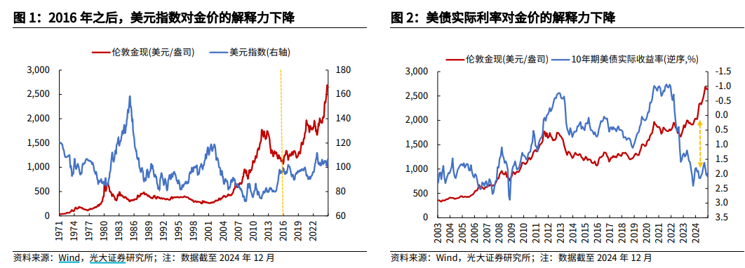 2024年11月以來,伴隨美元指數走強,黃金價格自高位震盪回落,黃金價格階段性承壓。但中長期來看,隨着國際貨幣體系搖擺,黃金價格已經走出獨立行情,美元信用已經成為黃金定價的主要因素。
