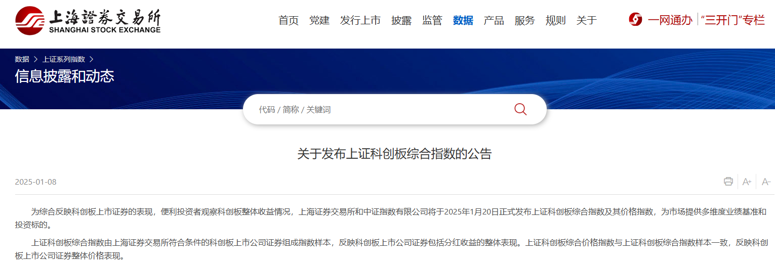 【環球網財經綜合報道】上海證券交易所和中證指數有限公司聯合宣佈,將於1月20日正式發佈上證科創板綜合指數(簡稱“科創綜指”)及其價格指數上證科創板綜合價格指數。科創綜指將全面反映科創板市場的整體表現,為投資者提供更全面的市場參考。