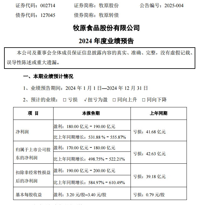 2025年1月9日,牧原股份(002714)發佈的2024年度業績預告顯示,公司預計實現歸母淨利潤170億元至180億元,扭虧為盈。