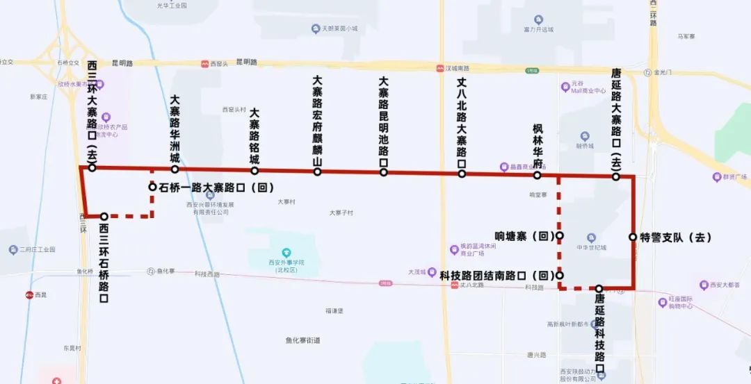 線路設置站點14個:西三環石橋路口、西三環大寨路口(去)、石橋一路大寨路口(回)、大寨路華洲城、大寨路銘城、大寨路宏府麒麟山、大寨路昆明池路口、丈八北路大寨路口、楓林華府、唐延路大寨路口(去)、響塘寨(回)、特警支隊(去)、科技路團結南路口(回)、唐延路科技路口。
