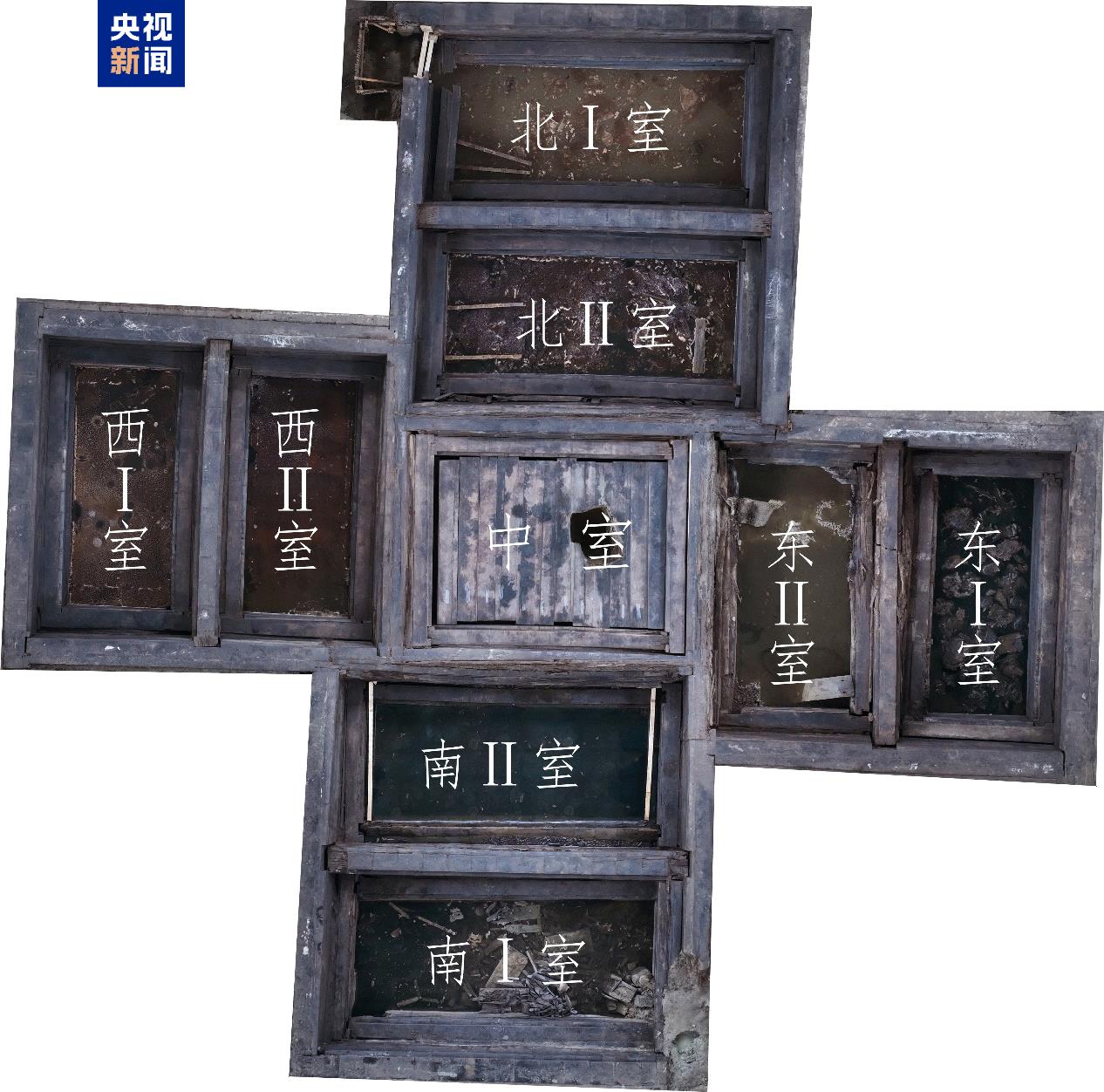 武王墩墓地利用古河道修築圍壕,整體近似方形。武王墩一號墓坐落在陵園中部,上部保存高約14米的封土,墓坑為近方形豎穴土坑,邊長51米、深20米,東側有長約42米的斜坡墓道,墓坑四壁有21級台階逐級內收,坑內填土層層夯實。墓坑中部用枋木構築“亞”字形槨室。槨室分為九室,中央為棺室,內置三重髹漆木棺,棺室四周分列八個側室,放置各類隨葬器物。槨室所用木材上均寫有墨書文字及與之對應的刻鑿符號,標示槨板方位和側室名稱。墨書文字格式大體一致,是目前發現數量最多、內容最豐富的楚國墨書文字。