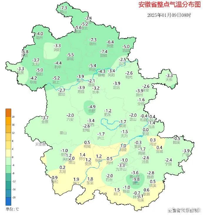安徽省氣象台預報,9日至10日受冷空氣影響,10日早晨全省最低氣温-7~-4℃。