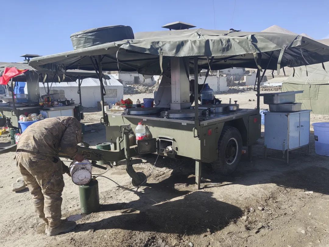 西藏軍區某團連夜架設帳篷、野戰宿營車等宿營器材,確保人民羣眾温暖過夜,野戰炊事掛車也開到震區,為受災羣眾保障熱食供應。