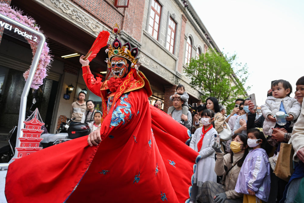在泉州中山路,遊客觀看變臉表演。新華社記者 周義 攝