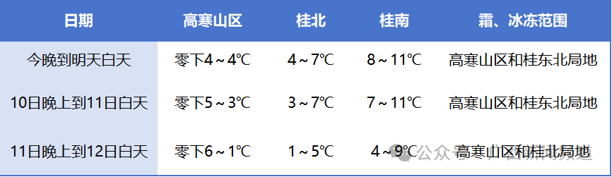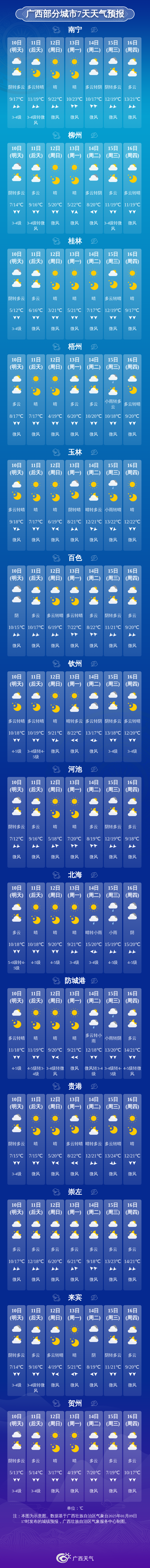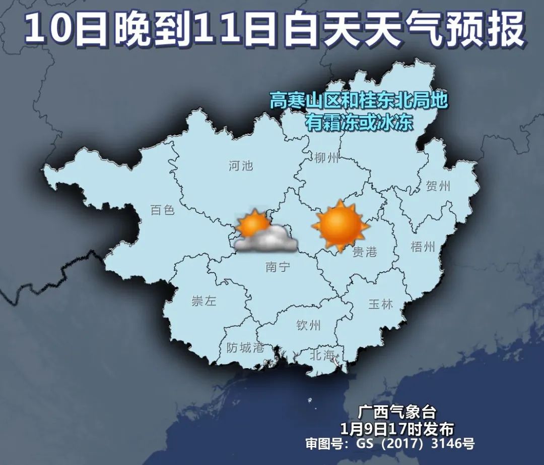 10日晚上到11日白天,全區多雲到晴。高寒山區和桂東北局地有霜凍或冰凍。最低氣温:高寒山區-5~3℃,桂北3~7℃,桂南7~11℃。