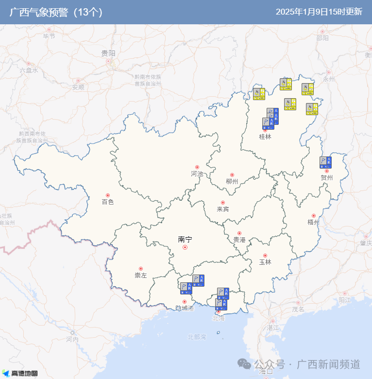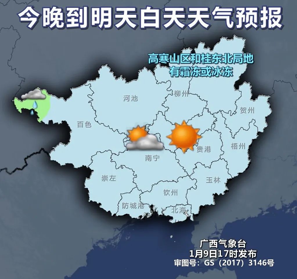 今天晚上到明天白天,全區多雲到晴,其中百色市北部局地有小雨。高寒山區和桂東北局地有霜凍或冰凍。最低氣温:高寒山區-4~4℃,桂北4~7℃,桂南8~11℃。