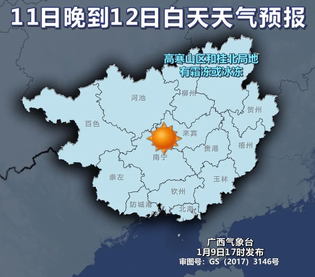 11日晚上到12日白天,全區晴天。高寒山區和桂北局地有霜凍或冰凍。最低氣温:高寒山區-6~1℃,桂北1~5℃,桂南4~9℃。