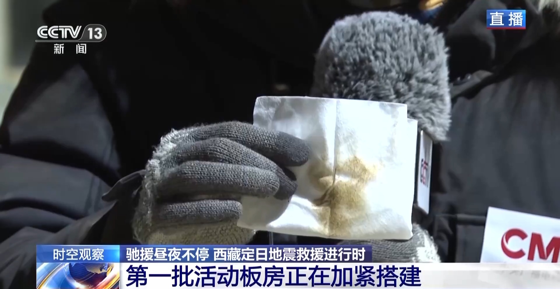 *總枱記者 呂小品:*我現在位於定日縣曲洛鄉一處活動板房安置點。現場的光可能不是很穩定,因為這個安置點經歷了大風揚沙天氣的考驗。我在户外就待了十幾分鍾,拿這張紙擦一下我臉上的灰,已經成這樣了。