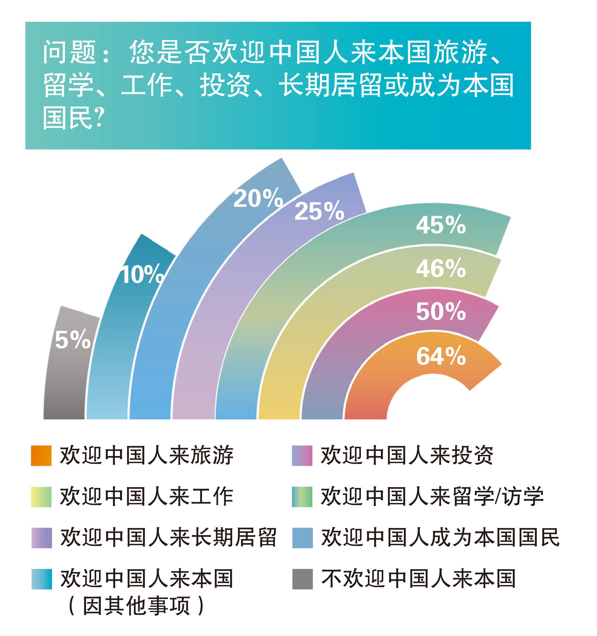 關於本國與中國關係的未來變化,62%的國外民眾希望變得更好,26%希望保持不變。非洲國家希望本國與中國未來關係更好的比例超過八成;發展中國家、中東國家和金磚國家的該比例為近七成;東盟國家超過六成。95%的國外民眾歡迎中國人到訪本國,其中,旅遊最受歡迎(64%),其次為投資(50%)、工作(46%)、留學/訪學(45%)。中國優化實施過境免籤政策後,近七成受訪者表示未來願意來訪中國。