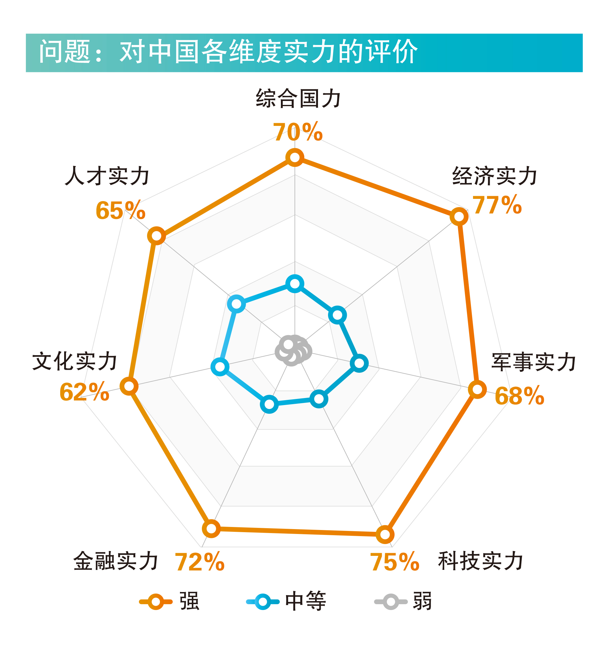 調查數據顯示,中國的綜合國力及各項實力被國外受訪民眾普遍評價為“強”。經濟實力強獲認可比例最高,達77%;其次為科技實力(75%)和金融實力(72%)。年輕羣體對中國科技實力的評價更高。非洲國家、金磚國家、中東國家、發展中國家有超過七成民眾認為中國綜合國力強;該比例在東盟國家和歐洲國家超過六成,在發達國家超過半數。
