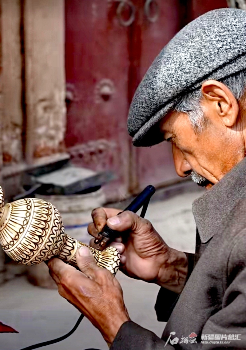 走進喀什古城,琳琅滿目的手工藝品讓來往遊客眼花繚亂,欣喜不已。在古城景區艾山玉山木製手工藝品店內,來自內蒙古的遊客張承運正在師傅的指導下用電烙鐵體驗木器燙畫,“這些木器上的花紋很古樸,非常有特色,自己燙一下就知道,看似簡單的花紋繪製起來一點兒也不容易。”他準備挑選幾件心儀的木雕工藝品帶回去作為新年禮物送給家人。