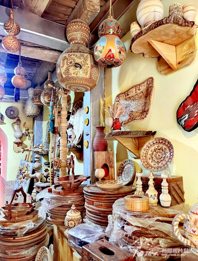 “木製器皿有韌性、不易變形,關鍵是特別環保,深受人們喜愛。我們當地居民喜歡購買木製擀麪杖、碗勺等,那些雕着花紋的木壺、樂器、葫蘆等最受國內外遊客喜愛。”玉山江説。