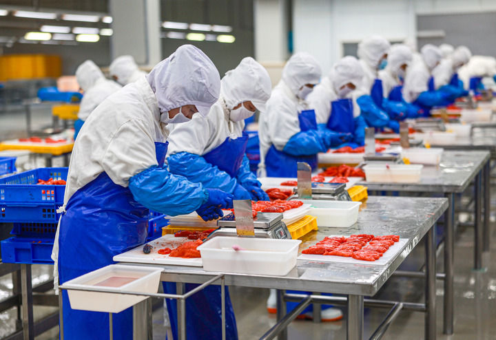 2024年4月22日,在山東省榮成市俚島鎮工業園區一家企業的車間內,工人在加工魚類製品。新華社發(李信君 攝)