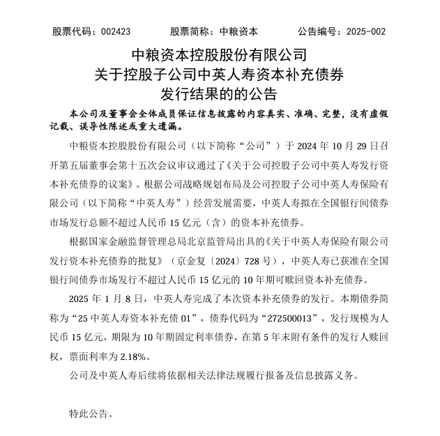 1 月 8 日,中英人壽完成了本次資本補充債券的發行。本期債券簡稱為“25中英人壽資本補充債01”,債券代碼為“272500013”,發行規模為人 民幣15億元,期限為10年期固定利率債券,在第5年末附有條件的發行人贖回權,票面利率為2.18%。