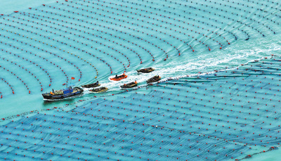 上圖:山東省榮成市愛倫灣海洋牧場,養殖工人在駕船作業。當地優化海洋資源配置,培育推廣海洋多層次生態養殖模式。