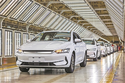安徽省合肥市長豐縣合肥比亞迪汽車廠區,新能源汽車整齊下線。長豐縣積極發展戰略性新興產業,新能源汽車產業集羣不斷壯大。