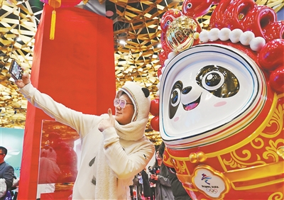 上圖:北京冬奧會吉祥物“冰墩墩”蛇年新春特別版——“蛇墩墩”系列新品在北京首發。圖為市民與“蛇墩墩”合影。