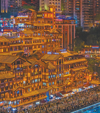 重慶洪崖洞景區燈光璀璨,遊客如織。景區內火鍋店眾多,吸引人們前來品嚐。