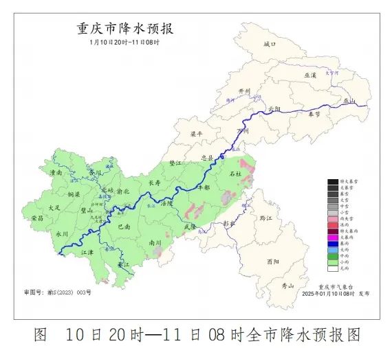 1月10日,重慶市氣象台消息,預計10日大部地區陰天到多雲,夜間中西部部分地區有間斷小雨或零星小雨,海拔800米以上地區有雨夾雪或小雪;11—12日各地多雲到晴,平壩河谷地區早上有霧。