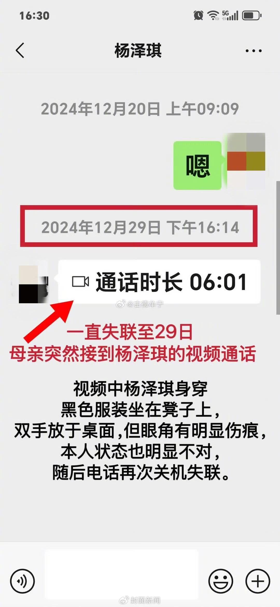 12月29日楊澤琪與母親打了視頻通話報平安,視頻中楊澤琪眼角有明顯傷痕,本人狀態也明顯不對,隨後電話再次關機失聯。